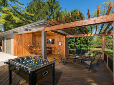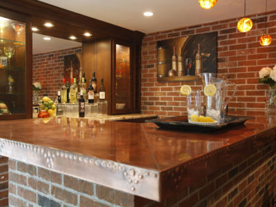 This project brings entertaining to a new level with an outdoor pool house with open air bar and changing room. The interior of the home was also remodeled to have a new bar with copper countertops and brick walls. Both areas connect to create an ultimate entertaining experience.