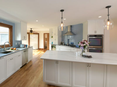 Kitchen and laundry areas were gutted; soffits were removed and new, white Shaker cabinets and Cambria quartz tops were installed. Several walls were removed to open the space. New hardwood floors were installed throughout the first floor. The kitchen features exceptional storage throughout, with a blue subway tile backsplash and under-counter lighting. Laundry and mudroom were updated too!